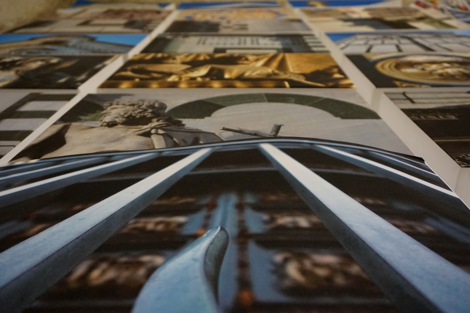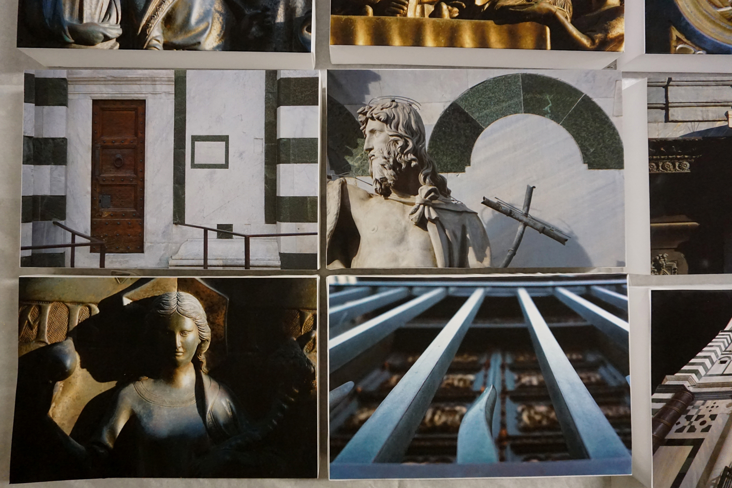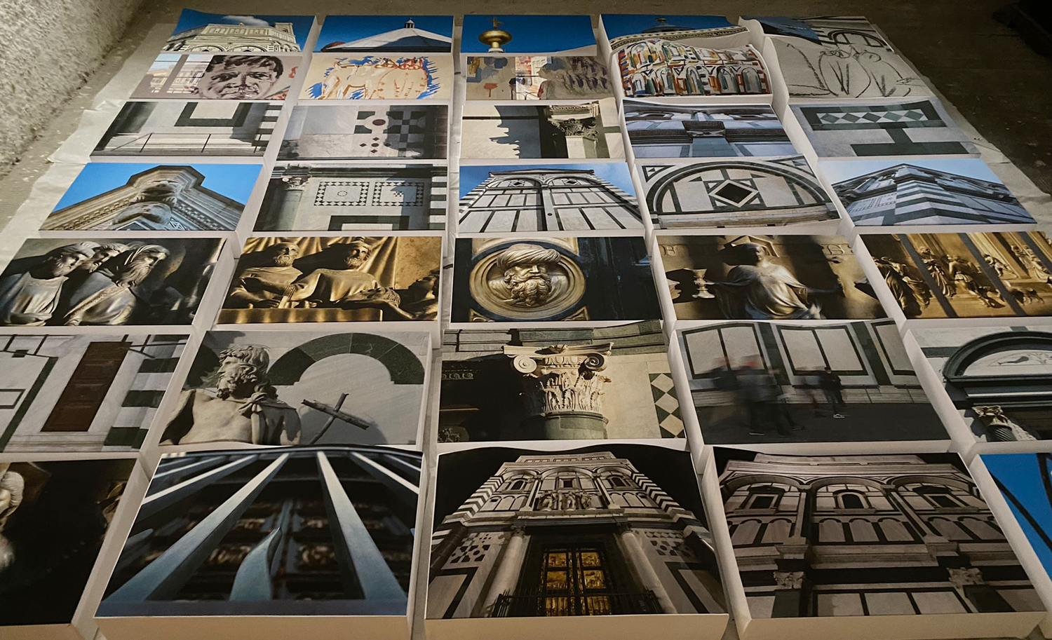 Il suo ingresso nel progetto ha inoltre posto prepotentemente argomenti di riflessione di ordine generale di non poco momento, quali il superamento dell’autorialita’ in una specie di ‘compartecipazione’ nella quale l’adozione-appropriazione delle immagini, quasi automatica nell’era digitale, non deve però prescindere dalla prospettiva interpretativa, obbligatoria qualora si affronti, come in questo caso, un soggetto del passato. Da qui può scaturire una nuova costruzione di senso della memoria collettiva relativa al battistero, attraverso appunto scatti multipli ma modulari, quasi parte di un puzzle continuamente variabile, le cui tessere offrono innumerevoli permutazioni, possibilità combinatorie e modulazioni volumetriche. Proprio grazie all’apporto di Roberto, alla sua sapienza tecnica e gusto, si è arrivati alla soluzione dell’allestimento definitivo: un quadrato composto da 36 quadrati posati sul pavimento. L’opera diviene così superficie fluida, nella quale le foto si increspano quasi fossero porzione di fiume che trasporta il tempo degli scatti, si muove lentamente in onde emotive che investono l’osservatore mentre ne percorre le “rive”, pervenendo a suggestivi esiti plastici, tra illusione ottica e anamorfosi. Quello che per essere visto richiede normalmente di allungare il collo, qui costringe ad abbassare lo sguardo: un ribaltamento delle abitudini al monumentale e alla sua museificazione mentale.
